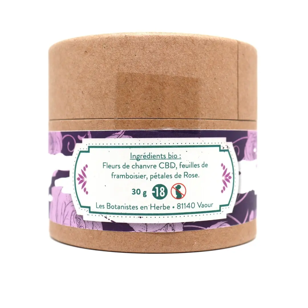 Ce mélange repose sur trois plantes soigneusement sélectionnées : une base de fleurs de chanvre CBD et de feuilles de framboisier, à laquelle viennent s’ajouter de délicates pétales de rose.